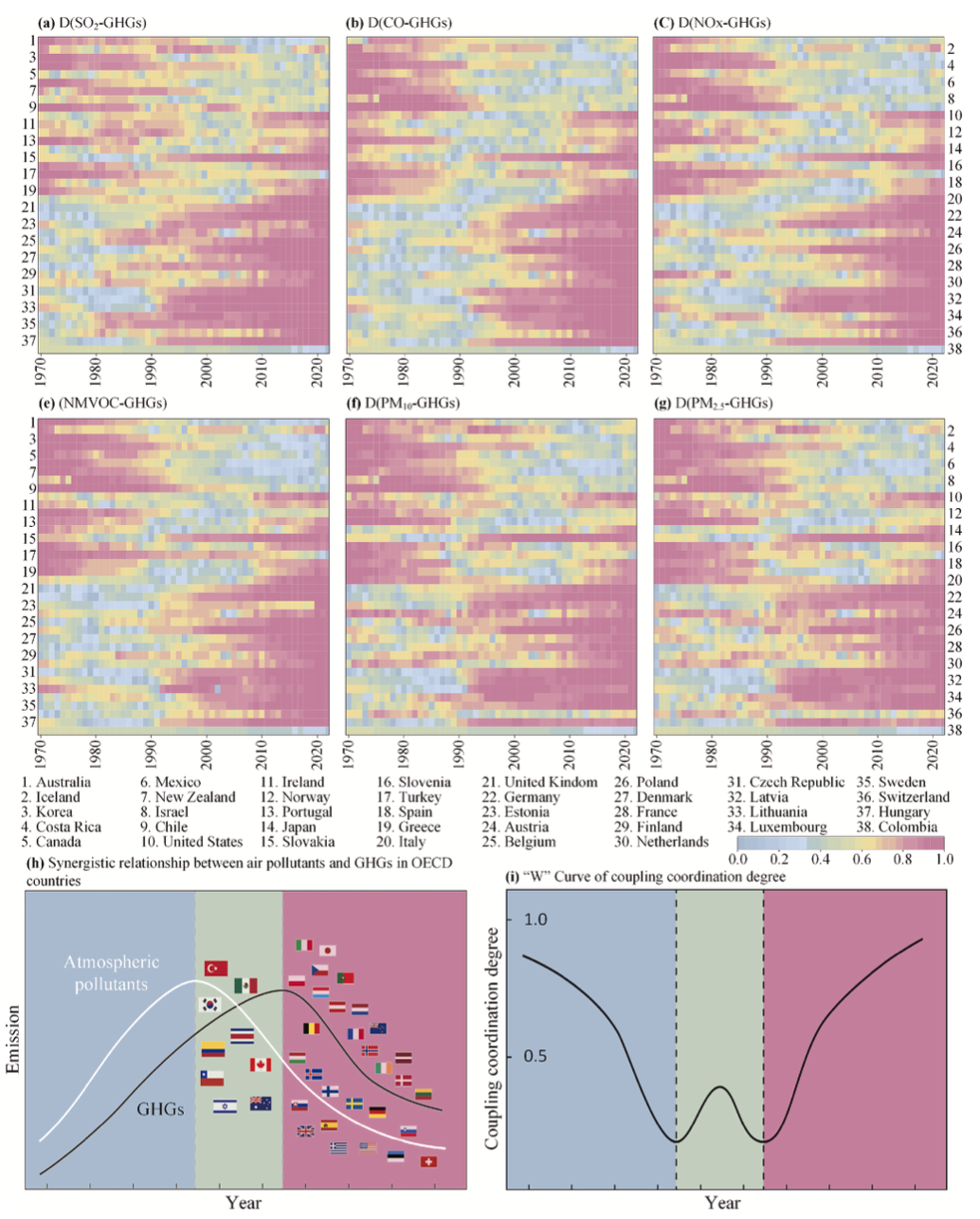 研究以38个OECD国家为研究对象,利用耦合协调度模型和时间边界识别模型,探究了1970-2022年共53年间6种代表性大气污染物与温室气体的排放趋势及协同关系演变规律,揭示出实施协同减排干预适宜的时间边界。结果发现,OECD国家中大多数国家的大气污染物和温室气体排放达峰时间具有先后梯次性,达峰时序依次为SO2、CO、NOX、NMVOC、PM10、PM2.5、GHG。大气污染物和温室气体排放耦合协调度呈现出W型趋势,依次呈现协同增排、不协同和协同减排三个阶段,英国、法国、德国等29个国家已处于协同减排阶段。不同大气污染物和温室气体从协同增排过渡到协同减排的时间边界为18-26年,其中,SO2与温室气体的协同减排时间边界最长为26年,是实施协同减排干预的关键期。协同减排时间边界可以通过缩短污染物和碳排放达峰时间来实现。对广大发展中国家而言,不同大气污染物和温室气体的协同减排措施应该在合适的时间阶段梯次有序开展,通过政策干预尽可能缩短协同减排的时间边界。