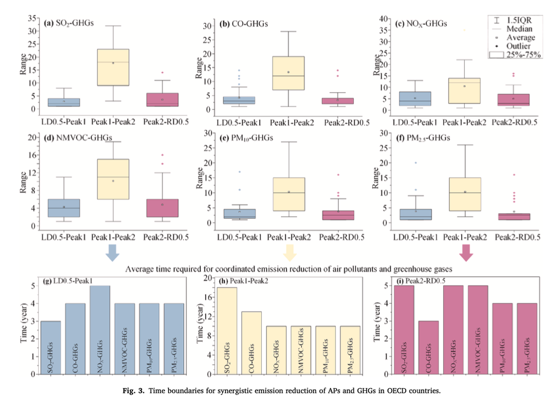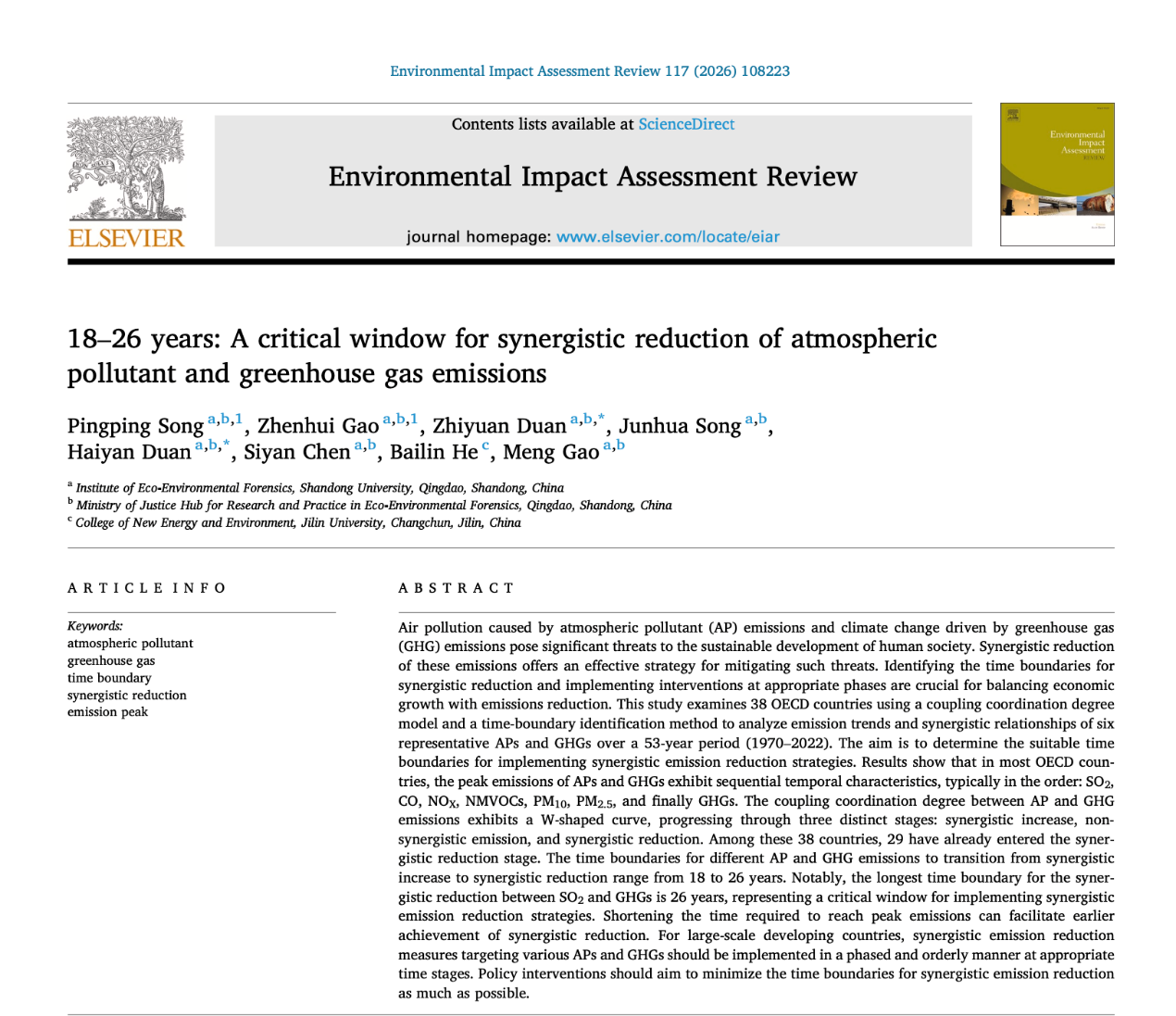 山东大学生态环境损害鉴定研究院段志远教师领衔完成的最新研究,在污碳协同减排领域取得新发现:“发达国家大气污染物和温室气体达峰时间呈梯次性,先后依次为SO2、CO、NOX、NMVOC、PM10、PM2.5、GHG,污碳协同增排过渡到协同减排的时间边界为18-26年”。相关成果以“18–26 years: A critical window for synergistic reduction of atmospheric pollutant and greenhouse gas emissions”为题发表在国际知期刊《Environmental Impact Assessment Review》(SCI、SSCI双检索,Q1,IF=11.2)上。硕士研究生宋萍萍为第一作者,教师段志远、段海燕为共同通讯作者,山东大学为第一单位。