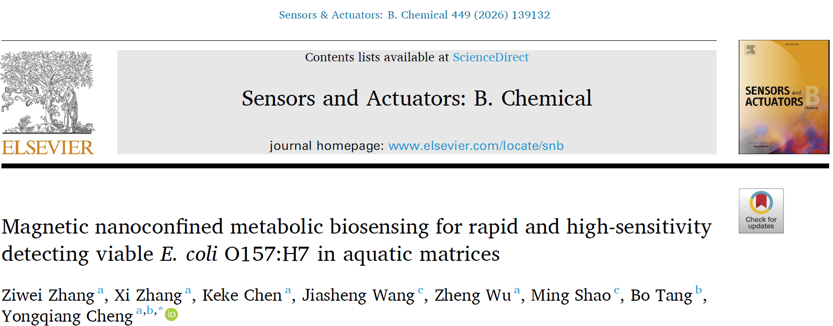 近日,山东大学生态环境损害鉴定研究院程永强研究员课题组在致病菌高灵敏检测领域取得新进展。相关研究成果以“Magnetic nanoconfined metabolic biosensing for rapid and high-sensitivity detecting viable E. coli O157:H7 in aquatic matrices”为题发表在国际分析化学传感领域权威期刊《Sensors and Actuators: B. Chemical》(中科院一区Top期刊,IF为 7.7)上。《Sensors and Actuators: B. Chemical》(简称SNB)是传感器领域的国际权威期刊,致力于化学传感器、执行器以及微系统领域的原创性最新重要研究成果。课题组博士研究生张子威为第一作者,程永强研究员为唯一通讯作者,山东大学为第一通讯单位。