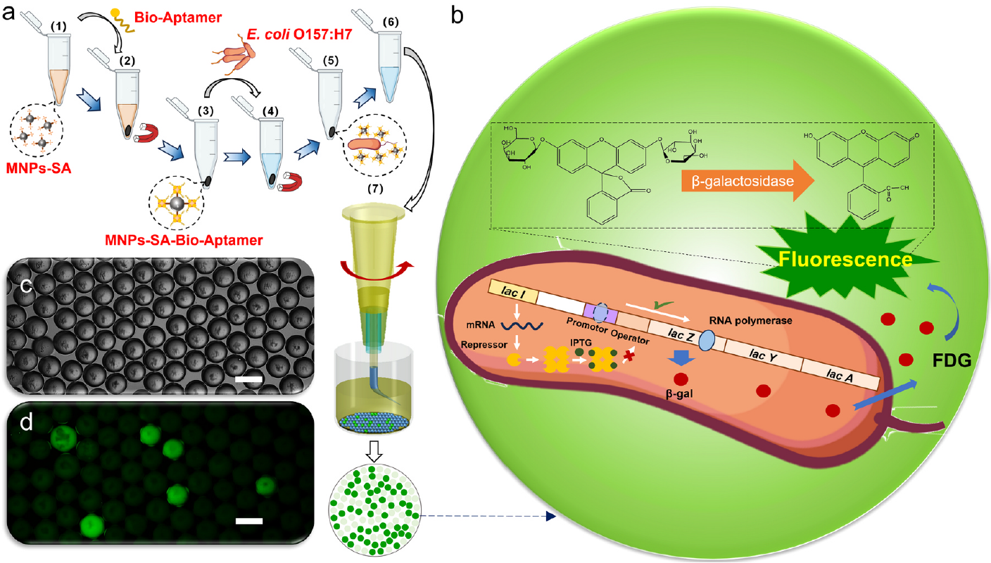 本工作,我们首先利用适配体修饰磁纳米粒子实现了对大肠杆菌O157: H7的高效特异性捕获富集。然后,将目标细菌连同Isopropyl β-D-1-thiogalactopyranoside(IPTG)和底物Fluorescein di-β-D-galactopyranoside(FDG)封装于纳升级微液滴中,通过细菌代谢产物β-半乳糖苷酶的局域积累产生可视化的荧光信号,以此实现单细胞水平的数字化定量分析。由于只有活菌能正常代谢β-半乳糖苷酶,该生物传感器能够排除死菌干扰,克服了qPCR分子诊断中假阳性的痛点。同时,纳升级空间的“限域效应”显著提高了酶反应效率,使检测时间缩短至3小时以内,动态范围覆盖10-10⁵ CFU/mL,最低检测浓度达到1.25 CFU/mL。